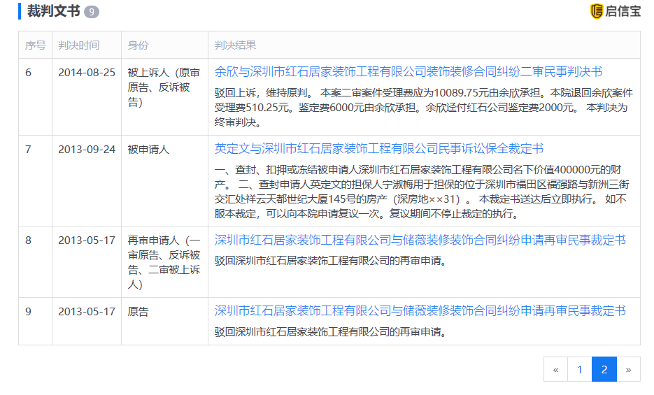 顺带一提,告别基因行业,我们再看看建筑行业,张核子目前任总经理一职、曾任负责人的深圳市红石居家装饰工程有限公司和法院打交道的次数,甚至还远远高于核子基因与华曦法医。经“启信宝”显示,该公司担任原告的次数很多,担任被告的次数也不少。