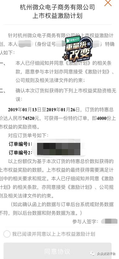 尽管股票代码和上市公司董事还没公布,但诸多经销商就已然按捺不住内心的冲动了,比如经销商王青青(化名),她就表示已经签署了《杭州微众电子商务有限公司上市激励计划》,在3月份,她先后共补货120盒。