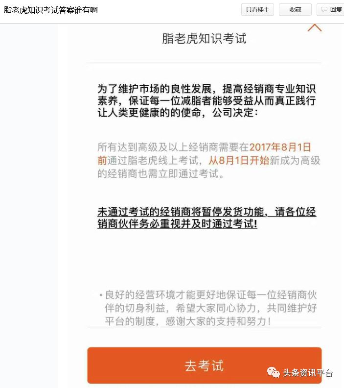 “脂老虎知识考试”早在几年前就已经开始实行了,高级别的经销商必须通过测验,否则将暂停发货,脂老虎这手亡羊补牢,事实上也只是让越来越多的经销商在贴吧上寻找试卷中的答案而已。不知道在这份试卷中有没有阅读理解环节,《晏子春秋外篇》中的“楚灵王好细腰,其朝多饿死人。”这句话,或许可以成为一个不错的考点,毕竟这是见于文献记载的中国历史上最早的节食减肥事例。