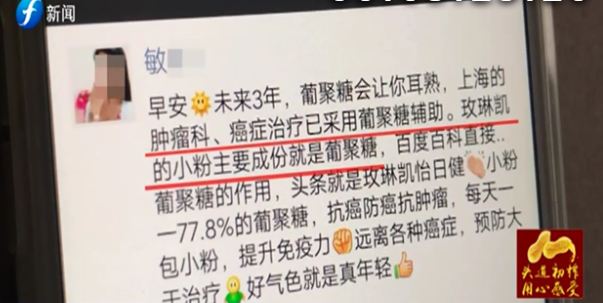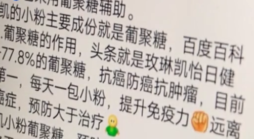 从郑先生提供的玫琳凯官方授权经销人员的朋友圈内容截图中可以看到,昵称为“小粉”的保健品被宣传的最主要功能是“抗癌抗肿瘤”,据说可以“吞噬癌细胞”。