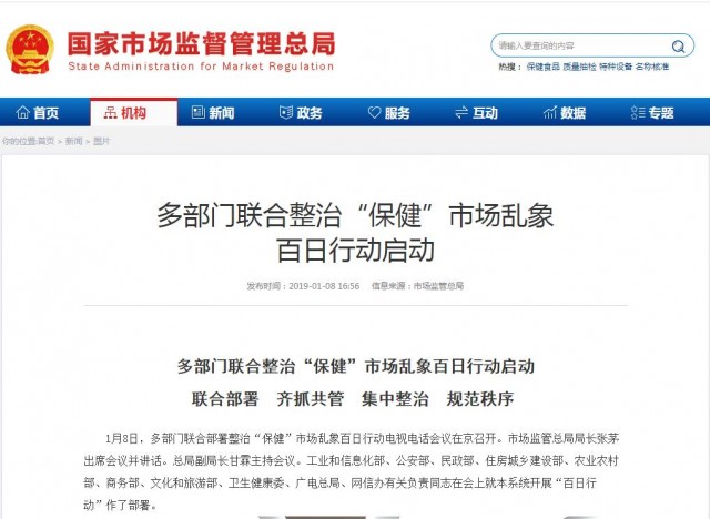 今年1月8日,国家市场监管总局等13部委宣布,在全国开展为期100天的联合整治保健市场乱象专项行动,将依法严厉打击虚假宣传、虚假广告、制售假冒伪劣产品等扰乱市场秩序、欺诈消费者等各类违法行为。