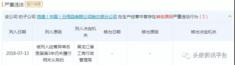 2018年7月13日,克缇哈尔滨分公司因未依照《企业信息公示暂行条例》第八条规定的期限公示年度报告,被列入经营异常名录届满3年仍未履行相关义务的严重违法企业名录。