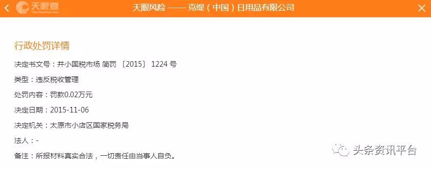 2015年11月6日,克缇山西分公司违反税收管理,遭太原市小店区国家税务局罚款0.02万元。