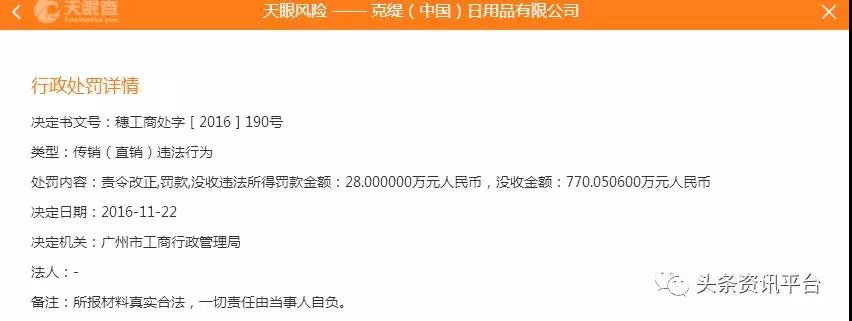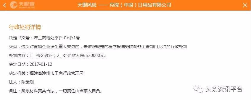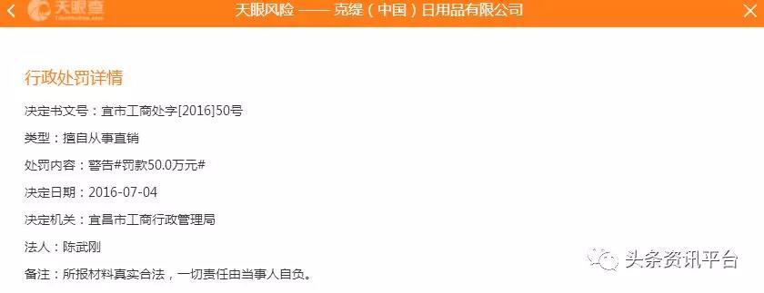 2016年7月4日,克缇湖北分公司因擅自从事直销活动,被宜昌市工商行政管理局警告并罚款50万元。