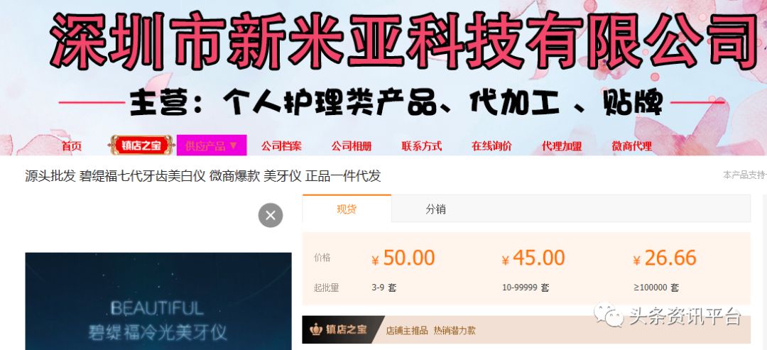 其中,由卖家“深圳市新米亚科技有限公司”进行“源头批发”的碧缇福七代牙齿美白仪的批发价最低甚至达到了26.66元,如此看来,零售价高达298元的这款产品的成本价甚至比这个价位还要低,其利润可见一斑。