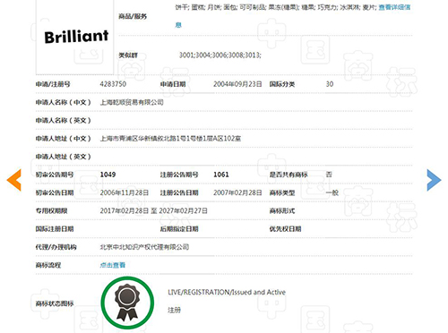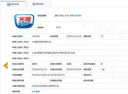 网信视点从中国商标网查询得知,Brilliant商标及光明商标确系上海乾顺贸易有限公司所有,但商标类别仅包含饼干、蛋糕、面包、月饼、可可制品、果冻、糖果、巧克力、冰淇淋、麦片,未写明包含饮料类。
