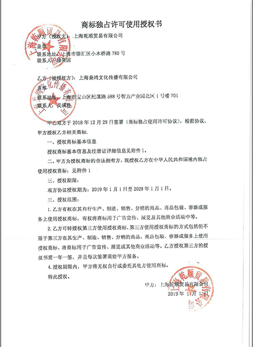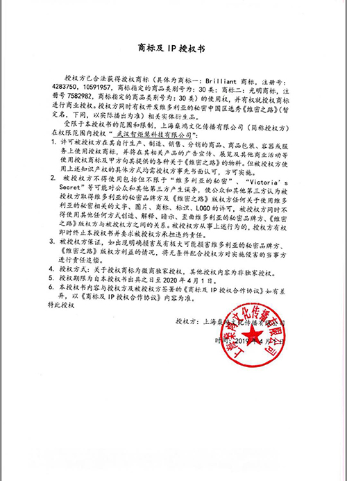 为了确认光明新零售是否真的拿到了光明烘焙食品有限公司的商标授权,笔者向张先生询问是否有相关文件,随即,他发来了两张合同扫描图。一张图片显示为《商标独占许可使用授权书》合同,内容为2019年1月1日,上海乾顺贸易有限公司将商标授权给了上海燊鸿文化传播有限公司,但图片中并未展示所授权商标的基本信息。另一张为《商标及IP授权书》,内容为2019年4月1日,上海燊鸿文化传播有限公司将注册号为4283750、10591957的Brilliant商标及注册号为7582982的光明商标的使用权,同时包括《维密之路》中国区选秀节目的相关实体衍生品的开发权授权给了智炬慧。