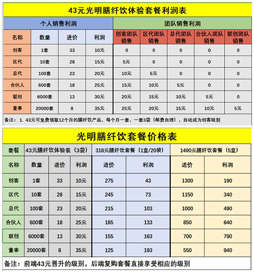 依据光明新零售的奖励制度,会员被分为创客、区代、总代、合伙人、联合创始人、董事6个层级。其中,消费者购买1套光明膳纤饮即可成为创客,享受33元的产品进价和10元利润收入。相较于梦满家268元的入门槛,光明新零售43元的入门槛可谓是更具诱惑力,或许是出于更容易拓展市场的考虑。从区代开始,会员可以享受团队收益,拿伞下所有团队成员的销售利润分成,层级越高,其所享受的团队收益也越高。但相应的,如果要享受这些奖励,你所投入的资金和发展的团队人数也呈梯级式发展。