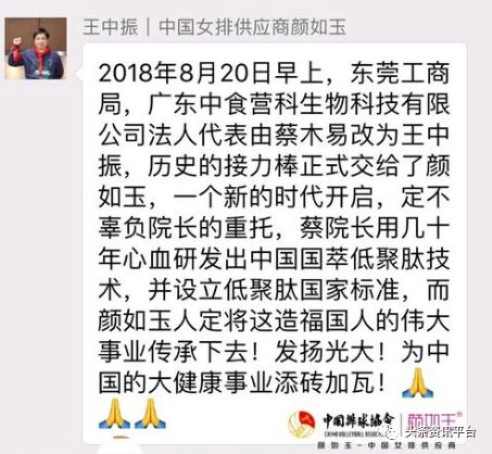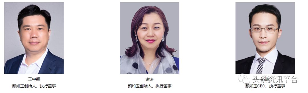 另外一家颜如玉的企业为广州颜如玉生物科技有限公司,该公司成立于2015年9月17日,注册资本500万元,法定代表人王中振,股东有钟鹏、谢涛、王中振。据公司官网介绍,颜如玉这个品牌的创始人是谢涛和王中振,公司目前的CEO是钟鹏。