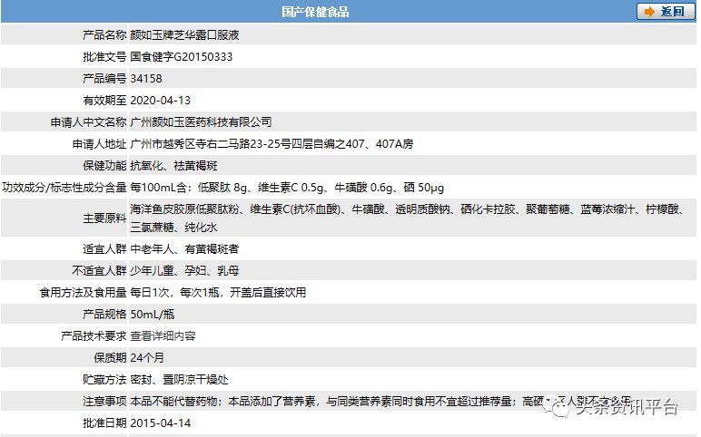 当我们在国家食品药品监督管理局网站上通过特殊用途国产保健品一栏中搜索广州颜如玉医药科技有限公司时,我们发现弹出的是“颜如玉牌芝华露口服液”,而非“颜如玉胶原蛋白低聚肽蓝莓果饮”。