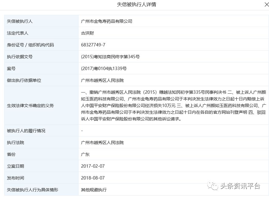 此外,据天眼查显示,金龟寿公司还有先后多次落入“失信被执行人”或“被执行人”名单中的不光彩的记录,颜如玉医药科技有限公司也曾牵涉其中。