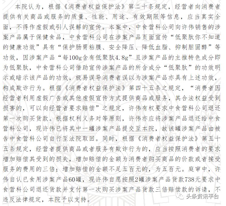 在这起纠纷中,杭州市余杭区人民法院最终认为,根据《消费者权益保护法》第二十条规定,经营者向消费者提供有关商品或服务的质量、性能、用途、有效期限等信息,应当真实全面,不得作虚假或引人误解的宣传。在这场官司中,中食营科公司向许伟销售的涉案产品属于保健食品,中食营科公司在涉案产品页面宣传“低聚肽你不知道的健康功效”具有“保护肠胃粘膜、安全降压、降低血脂、抑制胆固醇”等功效,因涉案产品“每100g含有低聚肽4.8g”且涉案产品的主推特色成分即为低聚肽,中食营科公司借助宣传涉案产品的所含成分“低聚肽”的功效明示或暗示该产品的功效,极易误导消费者误以为涉案产品亦具有上述功效,构成欺诈行为。