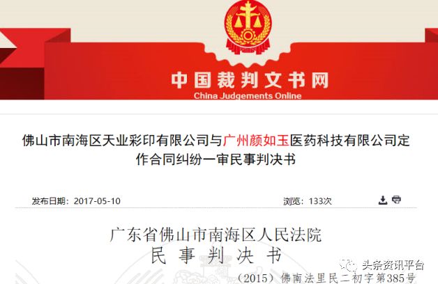 我们可以从颜如玉的纸盒包装说起,据中国裁判文书网显示,佛山市南海区天业彩印有限公司曾将广州颜如玉医药科技有限公司告上法庭,并诉称:2013年10月至2014年6月期间,原、被告有定作纸盒的业务往来,双方约定定作款的结算时间为货到月结,但被告惯常拖欠。