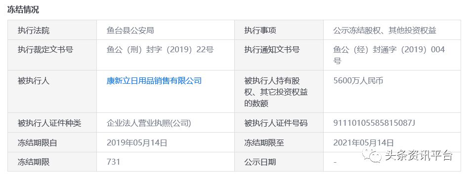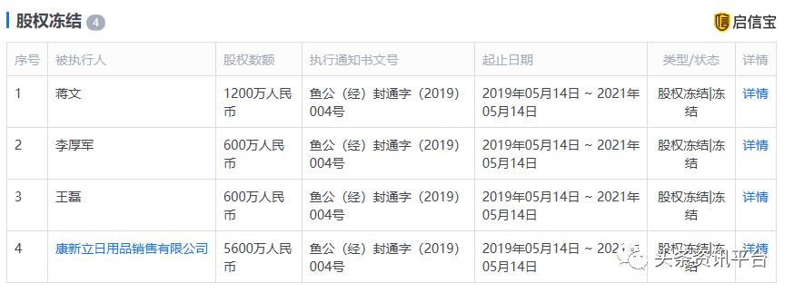 据悉,成立于2017年10月16日河北新康立生物科技有限公司是康新立日用品销售有限公司的子公司,法定代表人王磊,注册资本8000万元(截止2018年年报,实缴资金仅有康新立公司出资的5600万元),股东有李厚军、蒋文、王磊和康新立公司。2019年5月14日,这四个公司股东的股权都已处于冻结状态,王磊被冻结600万元,李厚军被冻结600万元,蒋文被冻结1200万元,康新立公司被冻结5600万元,执行通知书文号为鱼公(经)封通字(2019)004号。