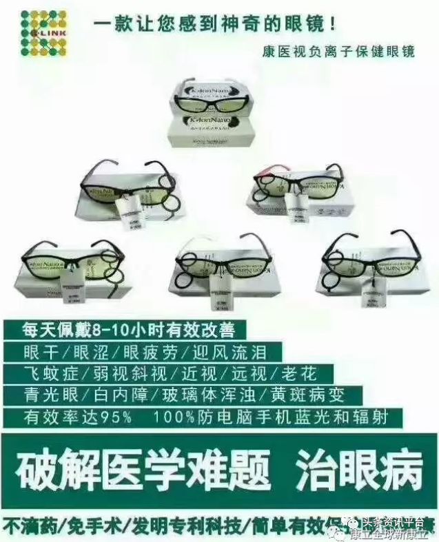 据宣传材料介绍,新康立公司的王牌产品“负离子医学眼镜”可以解决所有眼病,还能调理弱视,斜视,近视,远视 ,散光,老花眼,白内障,青光眼 ,眼干,眼疼,眼涩,眼压高,眼息肉,畏光、迎风流泪,飞蚊症,泪腺堵塞,眼底黄斑病变等疾病,且所有眼病患者不分年龄,度数不限(外伤造成的除外)。
