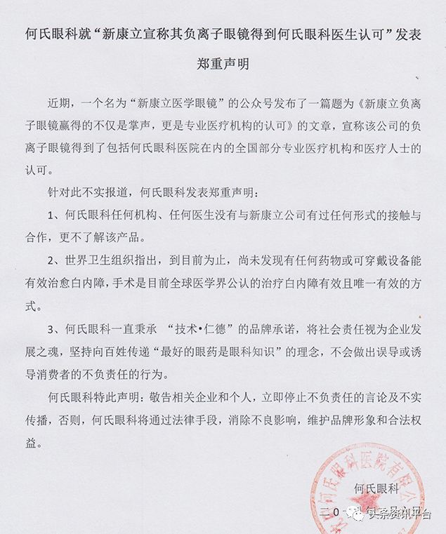 2018年2月6日,针对此不实报道,何氏眼科发表郑重声明:1、何氏眼科任何机构、任何医生没有与新康立公司有过任何形式的接触与合作,更不了解该产品。