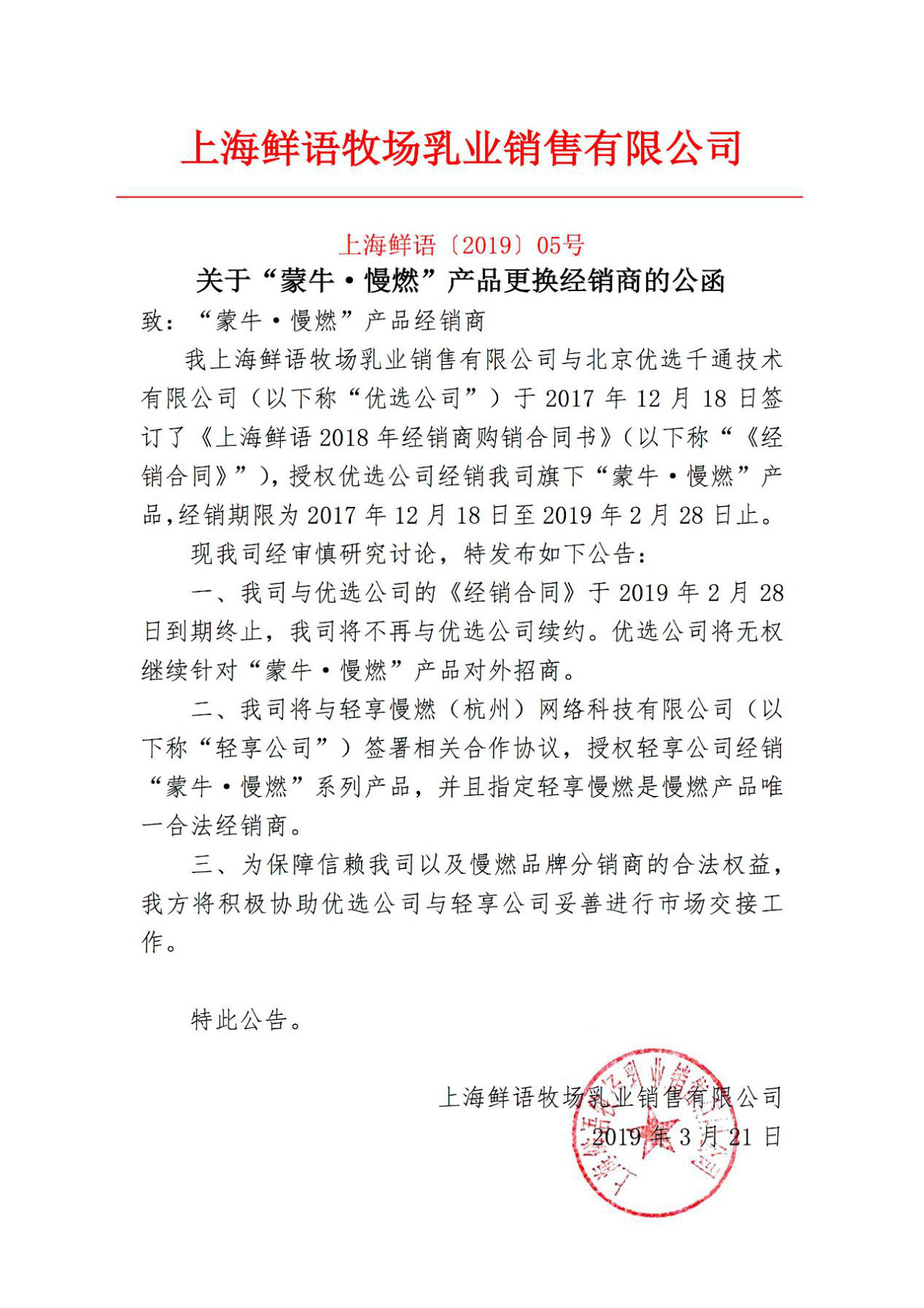 3月21日,慢燃新官方微信发布《关于“蒙牛·慢燃”产品更换经销商的公函》,称上海鲜语牧场乳业销售有限公司与优选千通合同终止后不再续约,优选千通无权继续针对慢燃产品对外招商。上海鲜语已与轻享慢燃(杭州)网络科技有限公司签署合作协议,并指定轻享公司为慢燃产品唯一合法经销商。同时,上海鲜语“将积极协助优选千通与轻享公司妥善进行市场交接工作”。