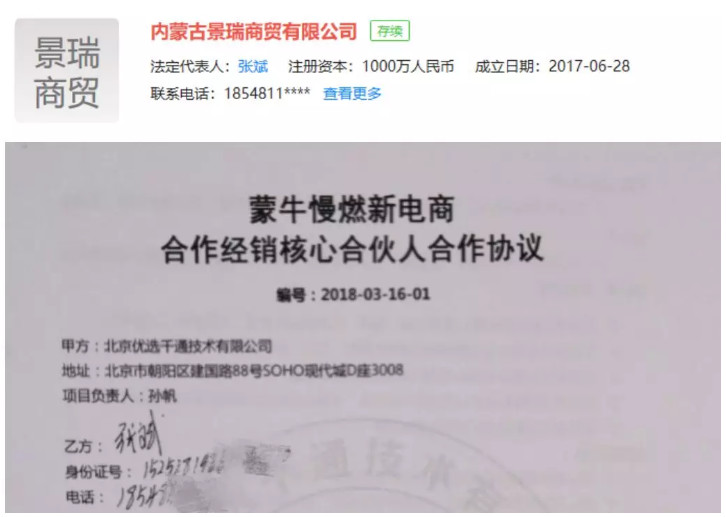同时,还值得注意的是,蒙牛慢燃项目最大的两家经销公司曾是天杞园项目的代理公司,分别是江苏苏浙国际商贸有限公司和苏浙国际旗下景天国际团队,其中景天国际团队在做蒙牛慢燃项目之后,单独注册成立了公司——内蒙古景瑞商贸有限公司,法人为张斌。