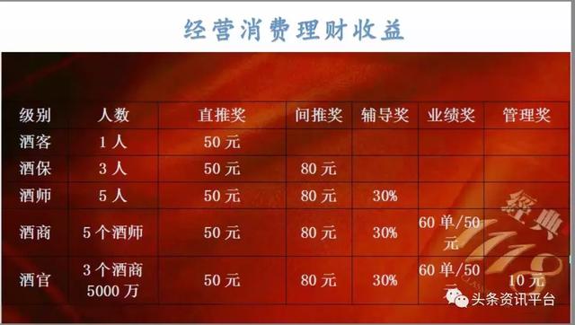 5、酒官:伞下销售累积达5000万元(直接分享达3个酒商)每单销售佣金10元,额外获得公司一定比例的原始股权奖励和优先代理权资格(服务费10元/瓶)。