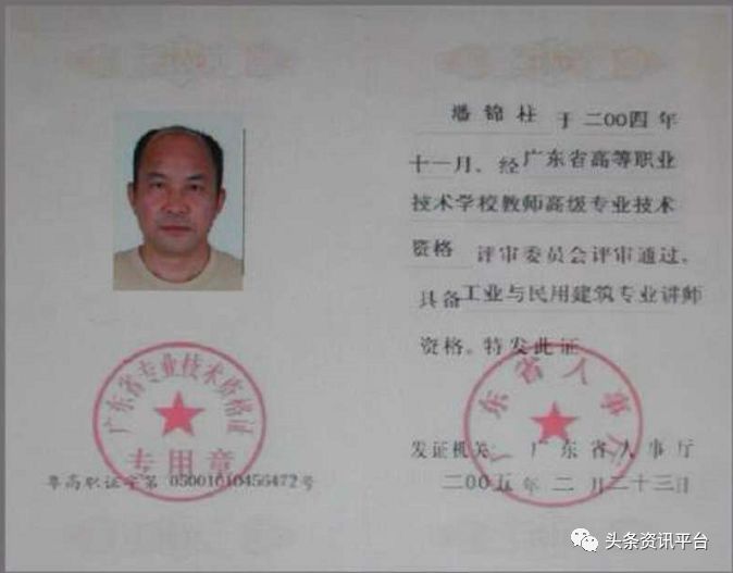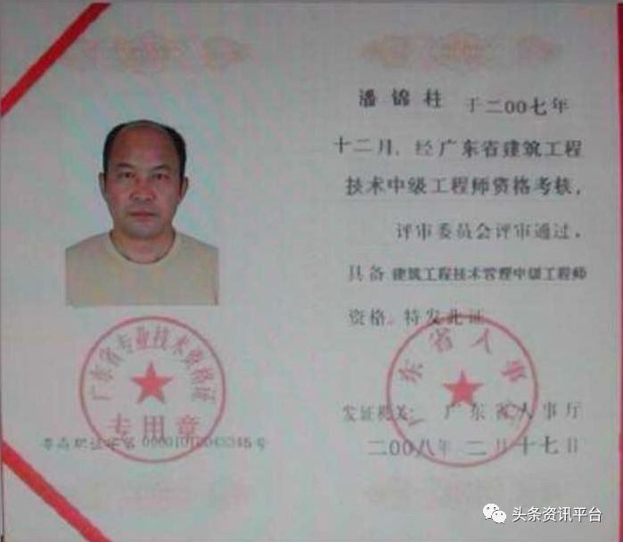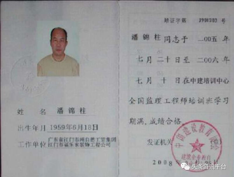 事实如此吗?所谓从医三十余年,可能有不少水分。调查发现,潘锦柱,男,汉族,1959年6月18日生人,所在地为广东省江门市蓬江区。2004年11月,潘锦柱获广东省高等职业技术学校教师高级专业技术资格评审委会员授予的“工业与民用建筑专业讲师”资格;在2005年7月到2006年7月期间,他还一直在中建培训中心全国监理工程师培训班学习;2007年12月,潘锦柱成为了“建筑工程技术管理中级工程师”,这些证书都说明潘锦柱是一个在建筑领域有所造诣的人。
