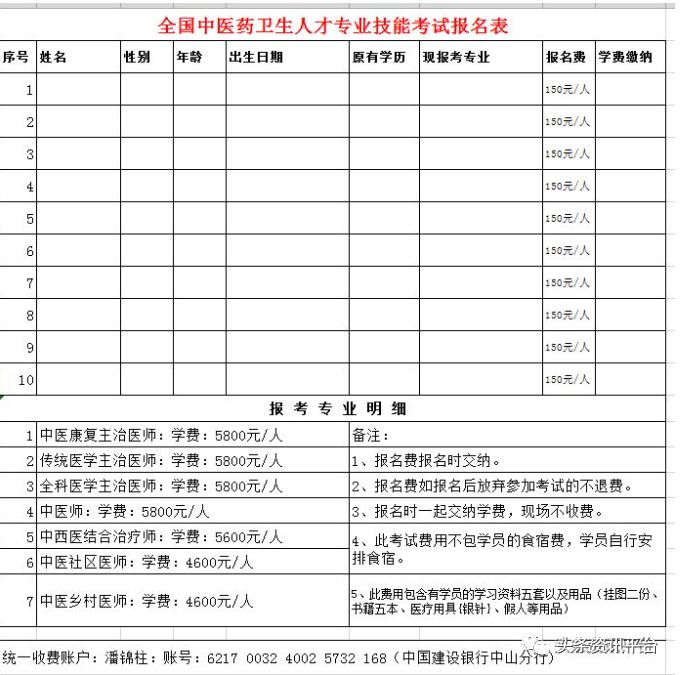 据悉,潘锦柱此前曾印制了一份《全国中医药卫生人才专业技能考试表》,上面就留有了自己的银行账号。号称是政府机构发证,但却以个人银行账号收款,如此敛财令人不可思议,更不可思议的居然还有人相信,这是怎么回事?