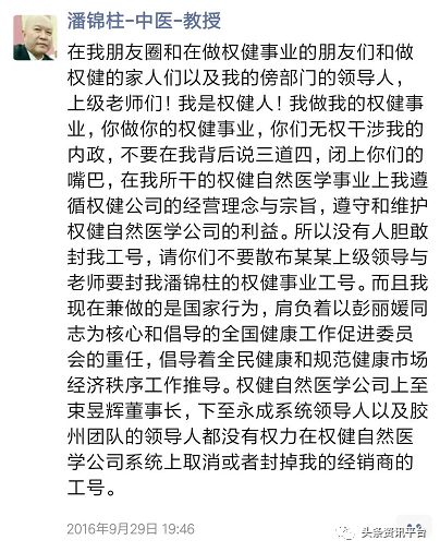 调查还发现,2016年到2018年期间,潘锦柱一直为当时的获牌直销企业权健服务,担任其经销商,并放言“权健自然医学是我一生托付与终生为它付出和代言的事业。”