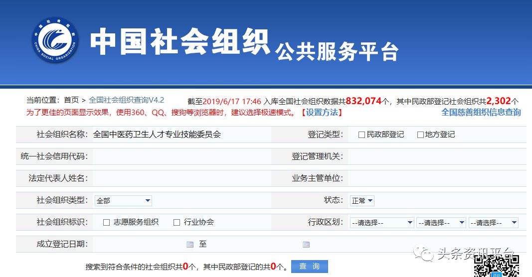 我们在中国社会组织公共服务平台上,搜索颁法此证书的“全国中医药卫生人才专业技能委员会”,并没有得到相关搜索结果的回应,而所谓“中医药卫生人才网”自去年4月25日起便已不再更新。