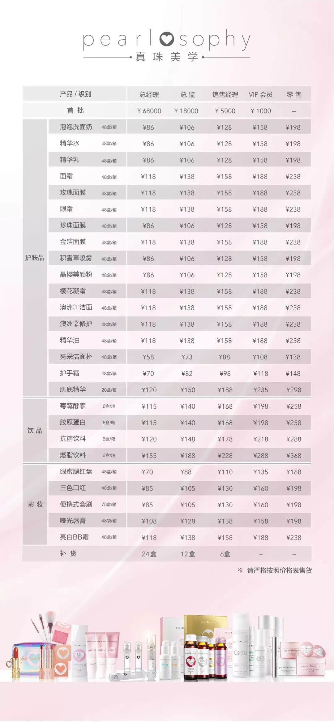 据了解,真珠美学的市场是五级代理模式,从低到高分别有:VIP会员(1000元)、销售经理(5000元)、总监(18000元)、总经理(即总代68000)。最高级别的董事(388000元)公司没有公开价格表。