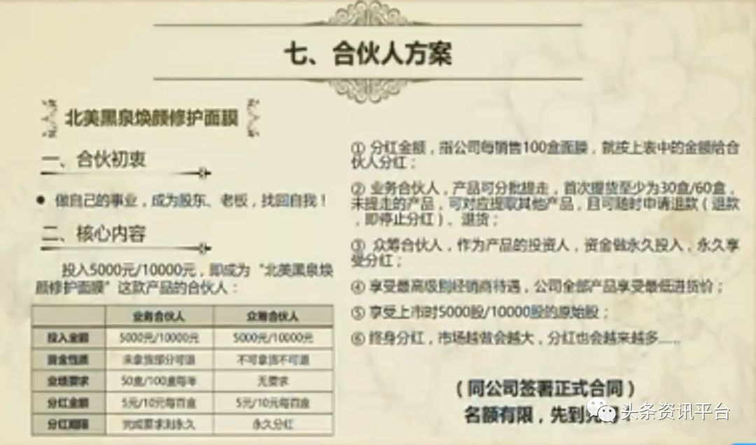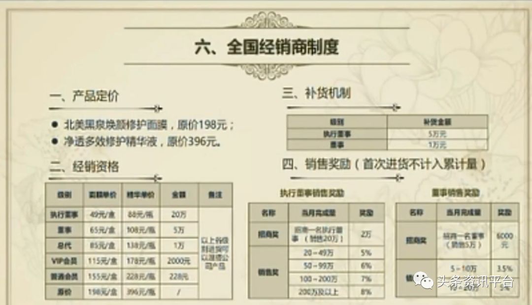 依托“净透多效修护精华液”和“北美黑泉焕颜修护面膜”等多款产品的“一树花香”,在2018年4月进入开盘试运营阶段,采用的微商结合双轨制的营销模式。