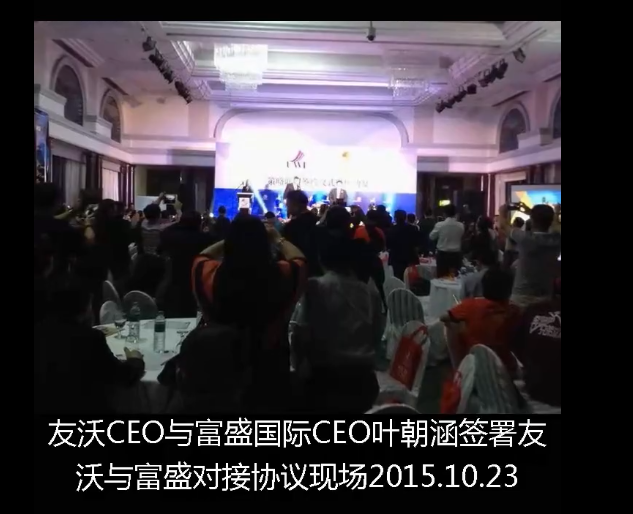 2015年10月14——16日(泰国会议)现场,富盛国际RIHC(如今改中文名:鼎盛国际)首席执行官叶朝涵宣布富盛国际与友沃国际成功“合并”。2015年10月23日,友沃CEO和富盛国际CEO叶朝涵正式签署对接协议。友沃国际与富盛国际两大平台合并,意味着天使俱乐部的天使会员将统一登录富盛国际会员后台,友沃后台关闭。