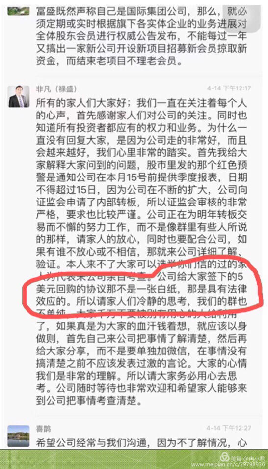 2016年富盛RIHC(鼎盛)国际会员签订的《IPO股份约定回购协议》已于2018年12月31日满足回购条件。但是鼎盛集团迟迟没有兑现,导致大批会员恐慌。