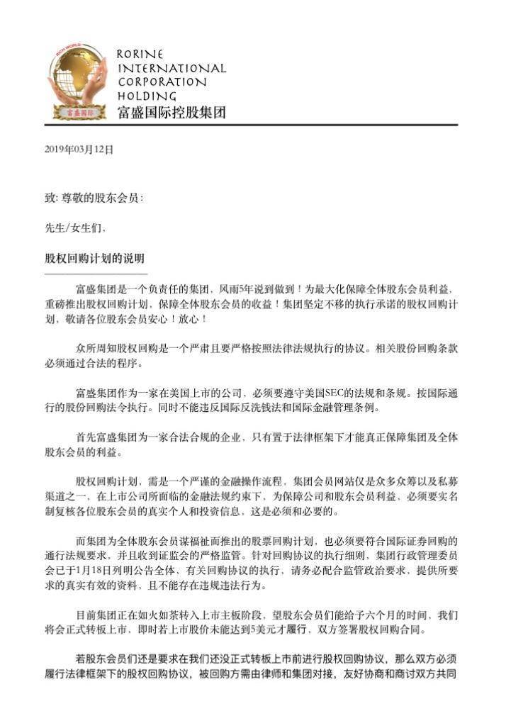 2019年3月12日下午在广州禄盛收到富盛-RIHC-鼎盛国际控股集团董事局《股权回购计划的说明》简称:(312说明)
