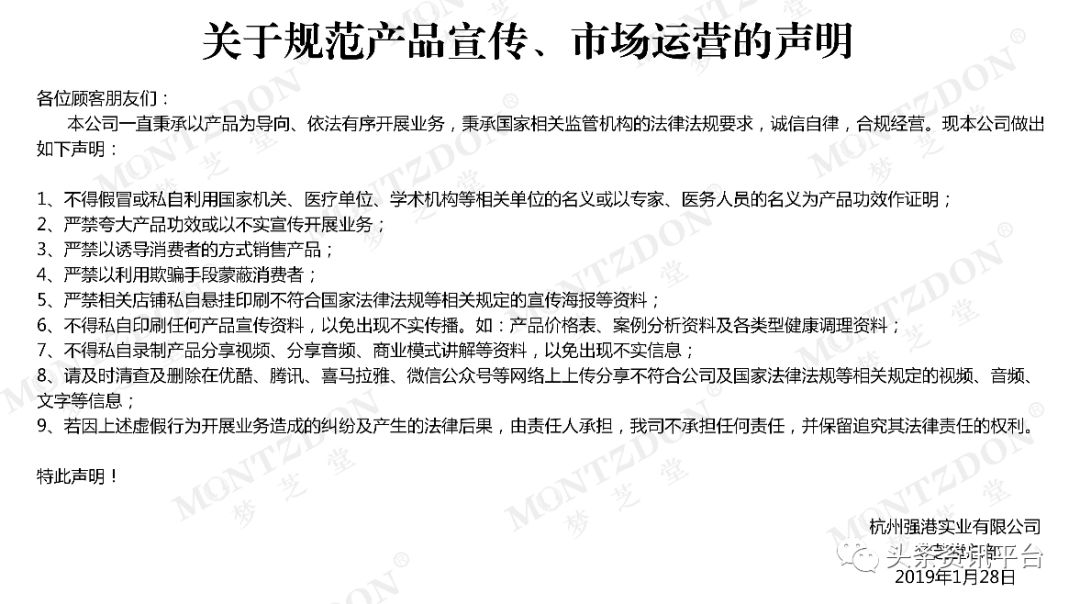 目前该公司官网还能打开,但一直显示“网站更新中”,在这次更新的公告里,我们看到“春节期间”的字样,可见,该公司的官网历经了半年多的时间依然没有完成网站更新。在其官网首页的显眼位置,仅有一份由梦芝堂总部在2019年1月28日发布《规范产品宣传、市场运营的声明》。