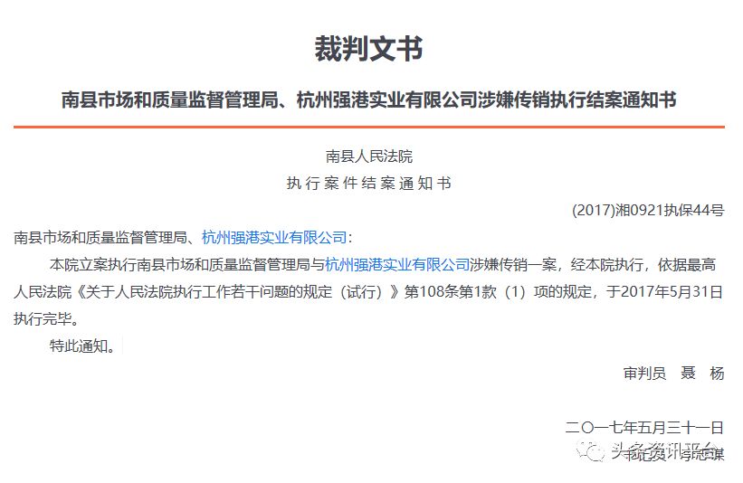 此外,在更早的时候,我们还查到了早在2017年就已公示出来的一则名为《南县市场和质量监督管理局、杭州强港实业有限公司涉嫌传销执行结案通知书》的裁判文书。