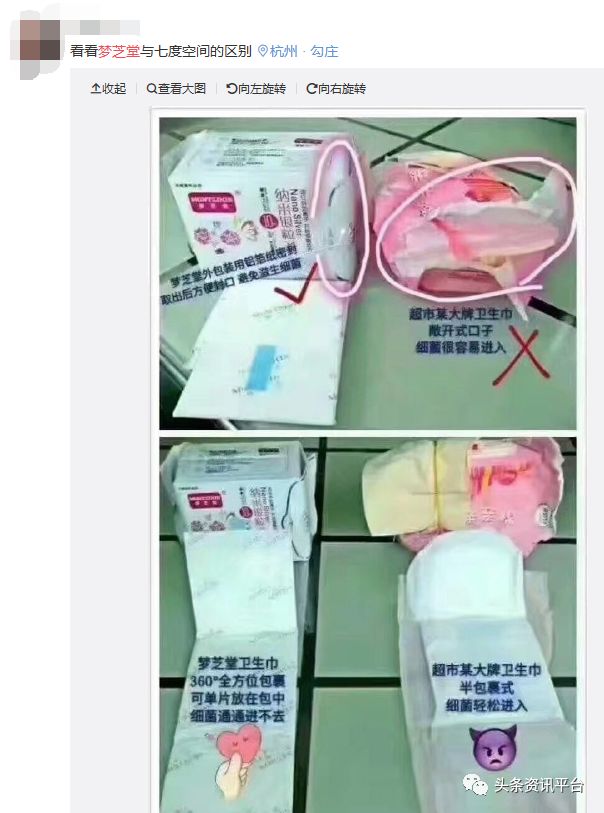 目前,我们在微博上搜索梦芝堂三个字时,发现有梦芝堂的代理商在推广梦芝堂的卫生巾时,将其与“七度空间”的卫生巾进行比较。至于这些比对材料是不是梦芝堂官方制作的,我们不得而知。