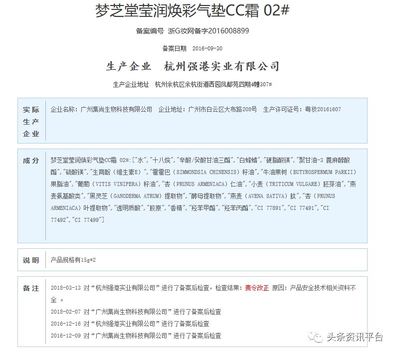 此外,经查国产非特殊用途化妆品备案服务平台,我们发现了一款名为“梦芝堂莹润焕彩气垫CC霜 02#”的产品曾在一次检查中,被责令改正,原因是产品安全技术相关资料不全 。