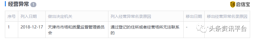 该公司现已因通过登记的住所或者经营场所无法联系而被天津市市场和质量监督管理委员会列入经营异常名录。