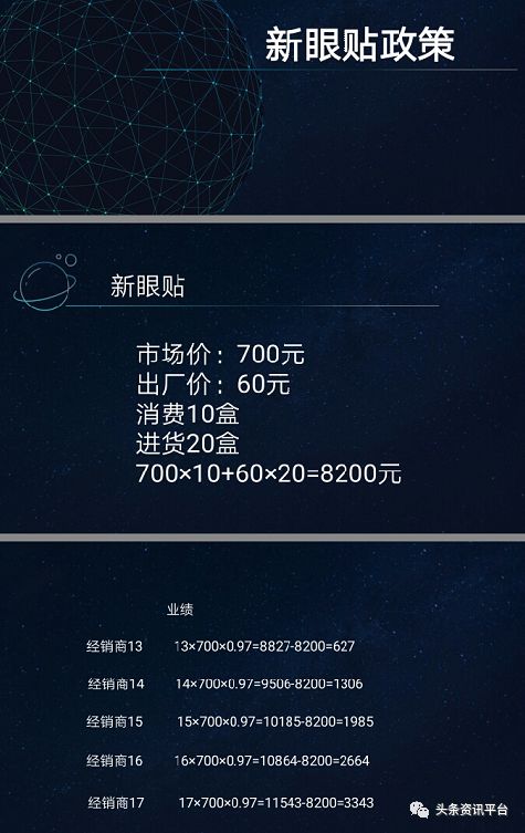 1。以每盒60元出厂价进货25盒眼贴。(共计1500元)平台挂卖20盒。按照零售价每盒300元售出。获得收益6000元。除去180元税金+1500元进货成本,实际获利:4320元。