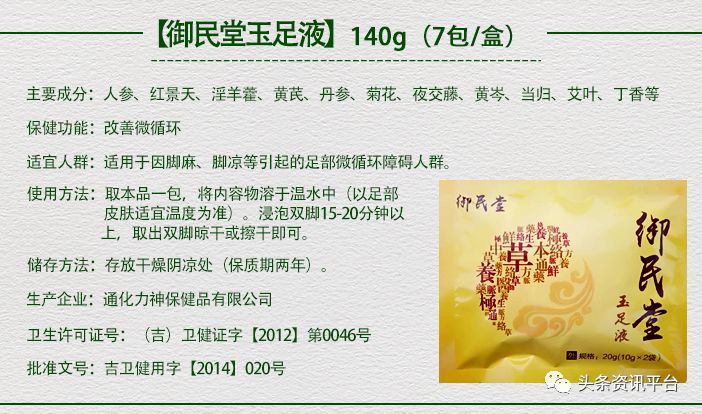 会上,御民堂带来了“御民堂玉足液”这款产品,据宣传材料介绍,“产品体验者徐强多年痛风,症发时疼痛难忍,在新产品玉足液的帮助下,24小时明显缓解疼痛,坚持使用效果明显,徐老师说:这款产品真的很神奇;产品体验者陆泓江先生,多年风湿,手指不能弯曲,左手不能拿东西,经过玉足液的调理,症状明显好转。”