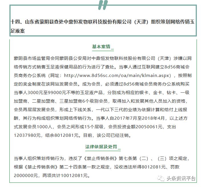 蒙阴县市场监管局会同蒙阴县公安局对中鼎恒发物联科技股份有限公司(天津)涉嫌以网络传销方式销售玉足液保健用品的行为进行了查处。经查明,当事人通过互联网建立8d56商城会员商务办公系统(网址:http://www.8d56sc.com/oa/main/klmain.aspx),按照制定的奖金制度在该网站发展会员。