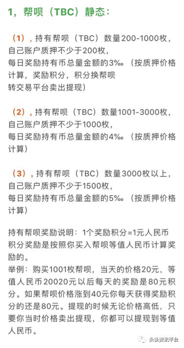为了更好的推动任务帮的市场运营,湖南硕利特设会员身份识别积分,即“帮呗”,是会员身份的象征,数量恒定,仅有2000万份。而工作人员表示,想投资“帮呗”必须要先成为硕利会员,条件是一次性购买“帮呗”满3000元,最多投资10万元。帮呗作为硕利公司发行的一种虚拟货币,也有发行价,并且有增值功能,如今一个“帮呗”卖102元,未来会涨到上万元。