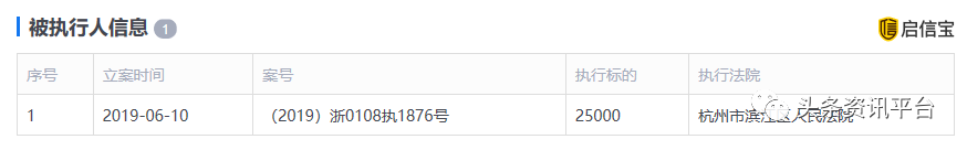 据启信宝显示,该公司在今年6月10日有一份由杭州市滨江区人民法院公示的被执行人信息。而在更早,该公司还曾在半年内先后两次遭受过有关部门的行政处罚。