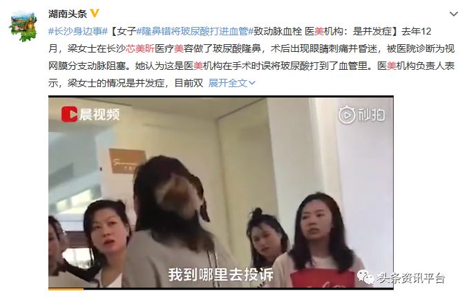 “一项简单的玻尿酸注射手术,却导致当场昏迷后送医”……据《三湘都市报》报道,市民梁女士在长沙芯美昕医疗美容门诊部做了鼻子微调手术,“结果医务人员把玻尿酸注射到了动脉血管”,梁女士当场陷入昏迷后送医。