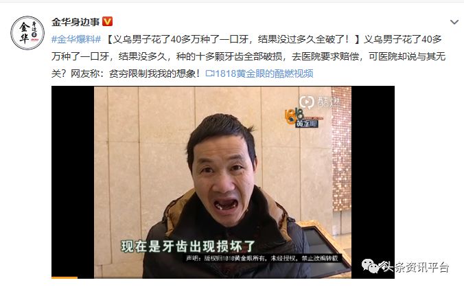 当然,涉及到相关问题的维权者并不只有其一、其二,前段时间,一则标题为“义乌男子花了40多万种了一口牙,结果没过多久全破了!”的新闻,就再次将“芯美昕”与“赔偿”联系到了一起,新闻内容也是大同小异:义乌男子花了40多万种了一口牙,结果没多久,种的十多颗牙齿全部破损,去医院要求赔偿,可医院却说与其无关。