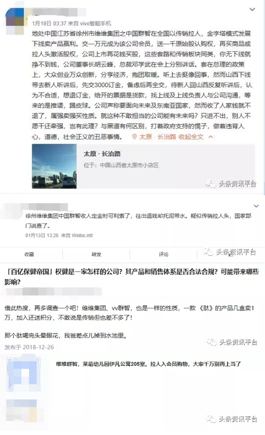 今年年初,在新浪微博、百度贴吧和知乎等平台上,陆续有网友投诉徐州群智涉嫌传销。而在调查过程中,我们也了解到了曾经推广过维维群智这个项目的会员张越(化名),该会员也反映自己“被骗了”:“刚开始还没有被骗,就是买多少的产品得多少分,积分可以对冲,完事了就没了,后来就不清楚了,现在早不做了。”