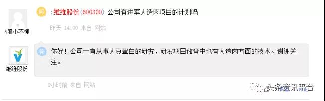 前段时间,A股中人造肉概念股获得资金青睐,维维股份作为主营豆奶粉、植物蛋白饮料相关的上市公司,在e互动平台中回复投资者关于公司是否有进军人造肉项目计划时,公司于2019年5月15日在回复中表示:“公司一直从事大豆蛋白的研究,研发项目储备中也有人造肉”,随后公司股价应声涨停。