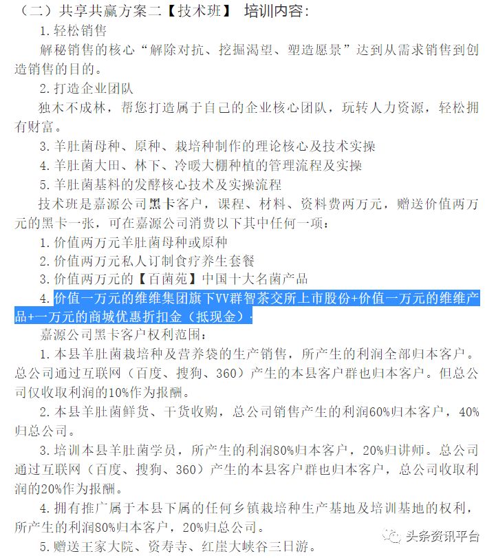 在网上,我们发现伴随着维维群智这个项目,总有一个叫做“原始股”的关键词伴随左右,这是真的吗?调查内容也印证了这一点,在维维群智与山西嘉源农业开发有限公司达成合作的相关页面中,我们也发现了一则名为“羊肚菌商业合作方案”的“共享共赢方案”。其中一个方案就涉及到了原始股,这项奖励具体内容为“价值一万元的维维集团旗下VV群智茶交所上市股份+价值一万元的维维产品+一万元的商城优惠折扣金(抵现金)”。