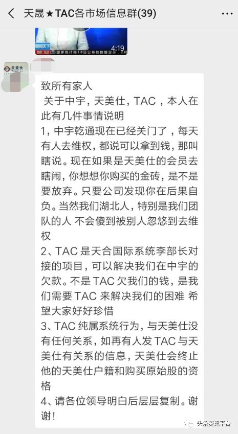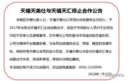 2018年2月,天美仕宣布与天福天汇终止合作。但在两个月之后,又有媒体曝光,还是原来的团队,依旧打着天美仕的旗号,以中宇乾通的名义卷土重来。