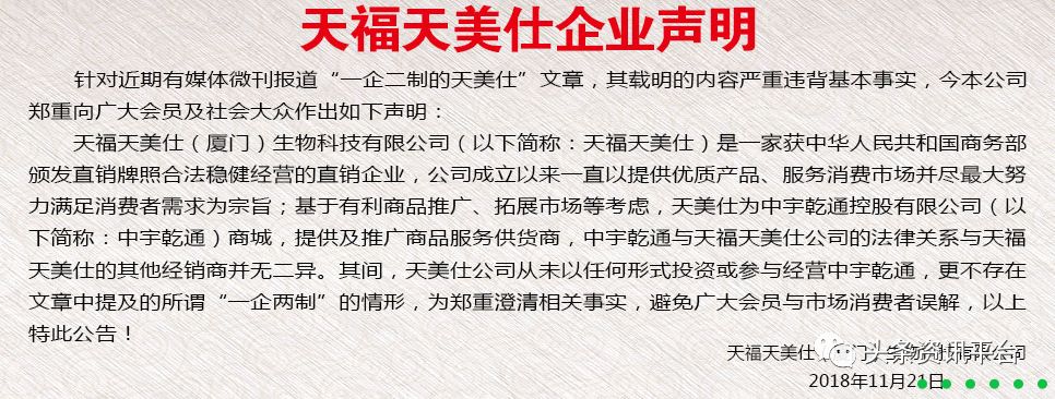 去年11月,有媒体以《“一企两制”的天美仕》为题,对天美仕在近年来的发展中所存在的诸多问题进行曝光,面对新一轮的质疑,当月21日,天美仕在其官网上发布了针对该篇文章的企业声明,该声明称“天美仕为中宇乾通控股有限公司商城,提供及推广商品服务供货商,中宇乾通与天福天美仕公司的法律关系与天福天美仕的其他经销商并无二异。其间,天美仕公司从未以任何形式投资或参与经营中宇乾通,更不存在文章中提及的所谓‘一企两制’的情形。”