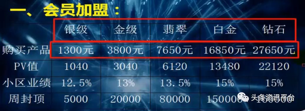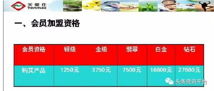 据其官网显示,目前天福天美仕的会员级别分为银级会员(600)、金级会员(3000)、翡翠会员(6000)、钻石会员(9000)和金钻会员(12000),这与早前几个版本的奖金制度所展示出来的会员准入门槛相比,已有了明显的差别,据当时宣传材料显示,天福天美仕的银级会员是1250元,金级是3750元,翡翠是7500元,白金是16800元,钻石是27600元。